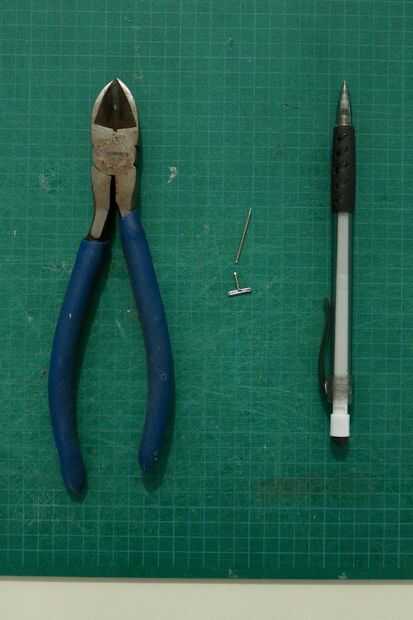 Antes de iniciar el proyecto, hice unas pruebas para comparar la efectividad de un clavo y el T-pin. Encontré que la clavija T rasgó el lado rugoso del papel que estaba usando, pero trabajó bien en el lado liso del papel, proporcionando un borde nítido, agudo. El clavo funcionaba bien pero hace un borde menos definido.