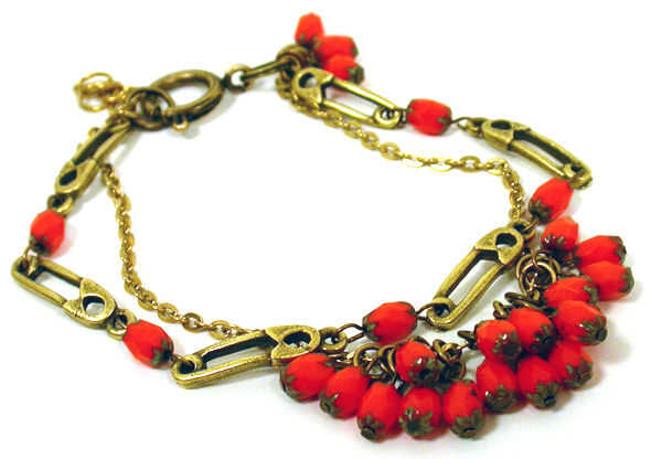este dulce, pulsera swingy características muy seguro perno curvado conector resultados y antiguo lavan granos rojos brillantes. Los pendientes de perla flotante darán los lotes de pulseras de movimiento y brillo. Este diseño se vería hermoso con una mezcla de granos si quieres un look más ecléctico.