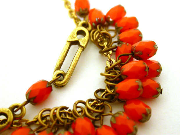 Con su cadena de pinzas de punta abren un anillo de salto pesado 7 mm. Pase a través del extremo imperdible link y a través del anillo en el cierre del anillo de resorte. Cierre firmemente. En el otro extremo de la utilización de la pulsera sus alicates de cadena para unir una de 5 mm saltan anillo al final link Pin. El anillo del salto pesados restantes a través de este anillo de 5 mm del hilo de rosca y cierre firmemente. Con su cadena de pinzas de punta de abren un hilo que a través de uno de los extremos de la cadena de la chispa y entonces sea pesado 7 mm salto anillo y anillo del salto oval. Cierre firmemente el anillo del salto oval. Se alimentan del extremo suelto de la cadena de la chispa a través de todos los anillos de salto el grano cuelga como se muestra.
