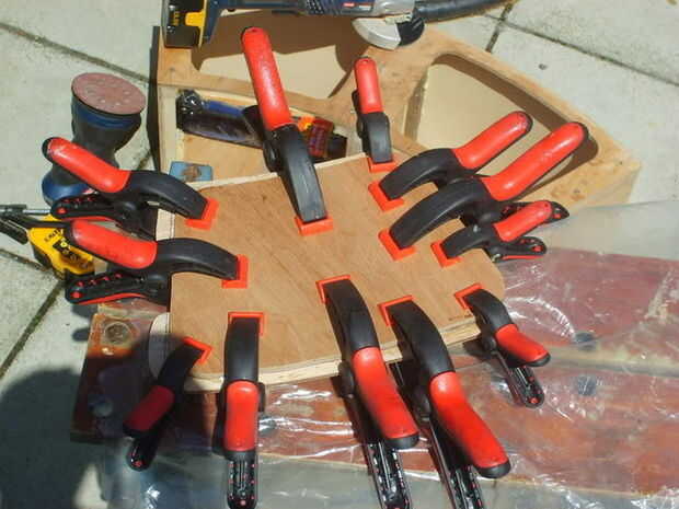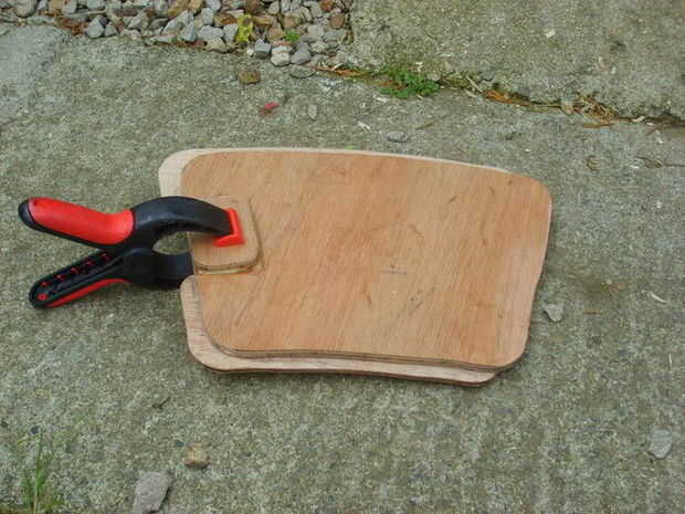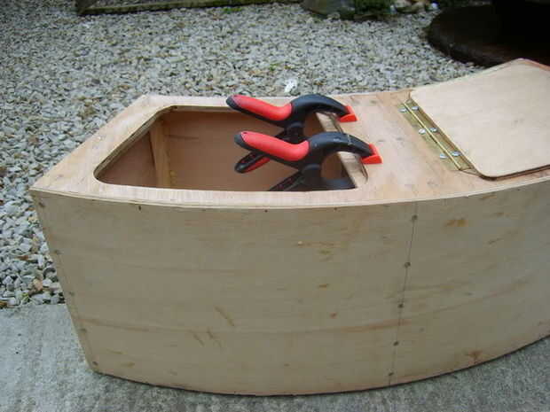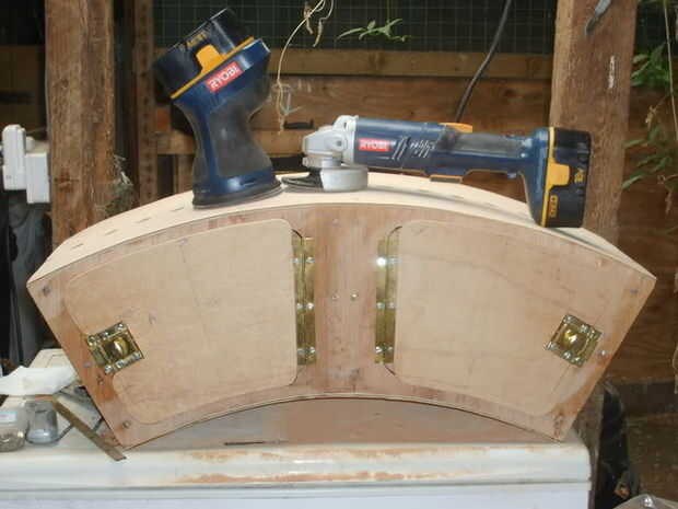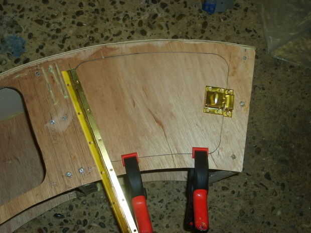 El original piezas que donde cortar desde la parte superior de la caja se marcaron hacia fuera para permitir que el pedazo de bisagra del piano y la captura a instalarse. Un doblador de 1/4 madera contrachapada gruesa, con un 1/2 pulgada sobre el regazo fue permitido para los dos lados, y el extremo del retén, el extremo de la bisagra se reducir para permitir el montaje de la bisagra. El doubler fue pegado utilizando adhesivo de poliuretano y afianzado con abrazadera para arriba.