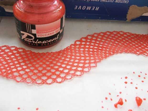 Puede teñirse con una pintura de tela de acrílico (lo hice sobre papel encerado). Había recortado las colas abajo después de que el acrílico se había secado.