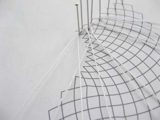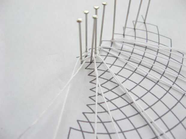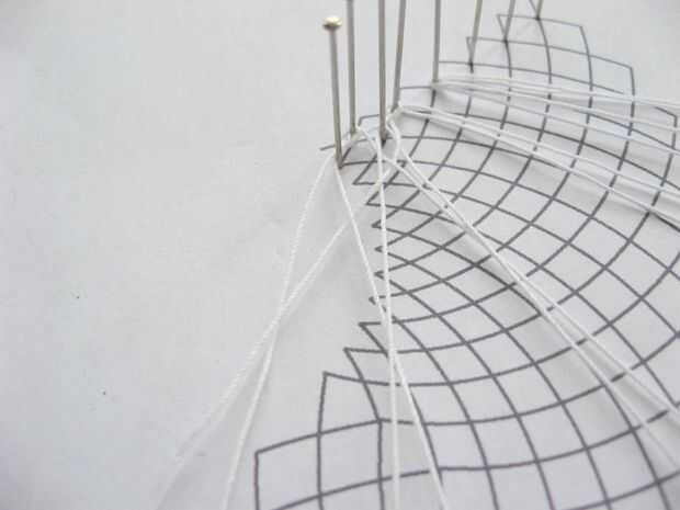 Coloque un alfiler en el punto más lejano izquierdo en el patrón. Envuelva las dos bobinas izquierdas alrededor de él. Girar una vez (derecha sobre izquierda).