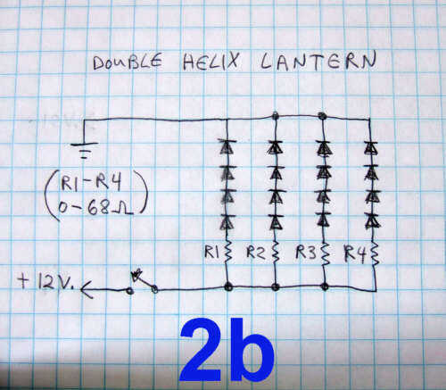 La linterna se diseña para funcionar fuera de 12 voltios, pero se puede convertir fácilmente a energía de batería portátil. Como es, poderes conjuntos de cuatro LEDs en serie. Un resistor de caída en serie con el LED sigue la corriente a través de cada led a 20 mA o menos. Puede utilizar cualquier LED estándar que desee. Pero usted tendrá que ajustar la resistencia de caída para cada cuatro LEDs como varían en resistencia según el color y el tamaño del led. Se puede utilizar cualquier número de cuatro LEDs conectados en paralelo como la corriente total no supere la capacidad de carga de tus hilos del cable de alimentación. Para este proyecto he elegido cuatro juegos de cuatro LEDs.
