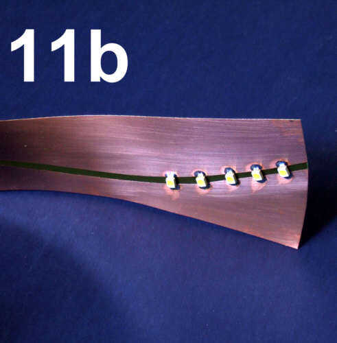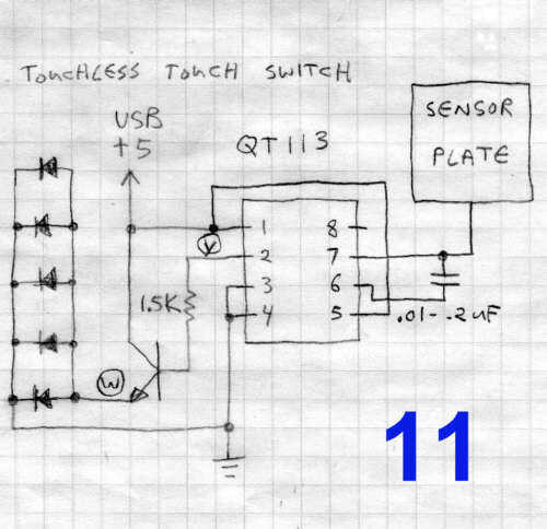 PIC11 muestra los detalles del circuito. El qt113 conduce un transistor de NPN 2n2222 que enciende los LEDs de 5 que están conectados en paralelo (pic11b). La base resistencia limita la corriente a los LEDs de menos de 100 ma. He utilizado LEDs de montaje superficial blanco pero podría usarse cualquier LED blanco.