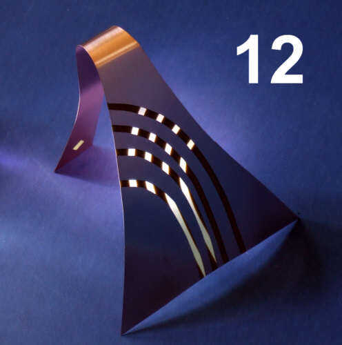 PIC12 muestra que una parte posteriora encendido platina curva que ha sido grabado con el mismo patrón en ambos lados. Porque es tan delgada la platina de fibra de vidrio, LED puede montarse detrás de la Junta y brillará a través. Este material de curvas del circuito es ideal para lámparas de pared u otros circuitos de suspensión.