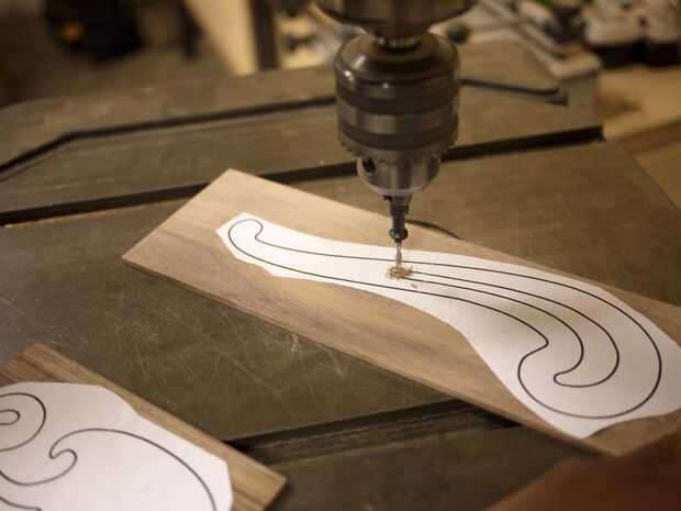 A continuación, taladré agujeros de entrada para cada uno del interior detalles - estos agujeros crean un lugar para insertar la hoja de sierra para corte de cada sección, sin tener que entrar desde el lado de la forma. Todo el interior son trozos, así que no importa mucho el tamaño del agujero - cualquier agujero que permite la hoja a través debería funcionar.