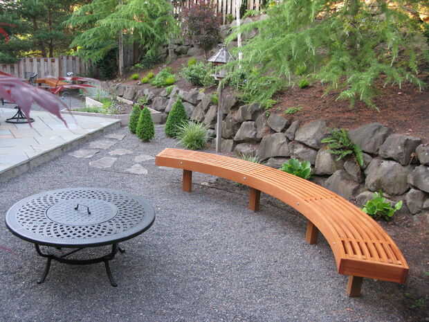 La forma de la banca fue dictada por el radio de la zona de grava en el plan de paisaje. Seleccionamos un radio interior de 83 con ocho carriles ancho 1.5 pulgadas espaciados una pulgada de distancia. Esto da un radio exterior de 92 en y un banco de "ancho" de 19 pulgadas. Queríamos que el Banco para ampliar de 90 grados encajar en el diseño y por lo menos 5 personas.