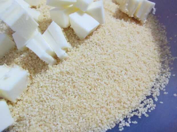 Mezcla 3 tazas de couscous fino con 3 cucharadas de mantequilla de sof, mezcle todo muy bien.