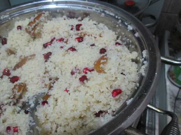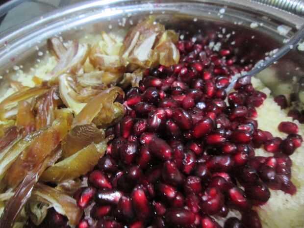 Cuando el cuscús esté cocido, apagar el fuego, añadir rodajas de las fechas y las semillas de la Granada y mezclar. (Usted puede agregar sabor en esta etapa si te gusta más intenso)