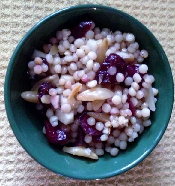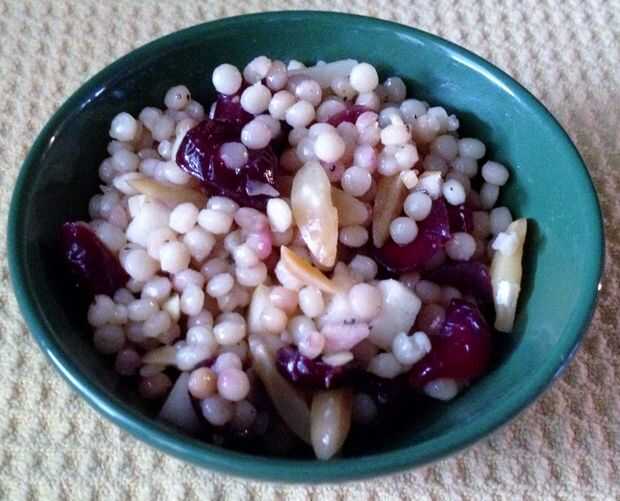 Ligeramente adaptado de la receta de Giada De Laurentiis aquí: http://www.foodnetwork.com/recipes/giada-de-laurentiis/israeli-couscous-with-apples-cranberries-and-herbs-recipe/index.html
