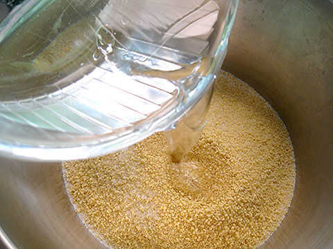 Salida de sémola y mojado con agua esta vez, mezclar bien para que los granos no se peguen.