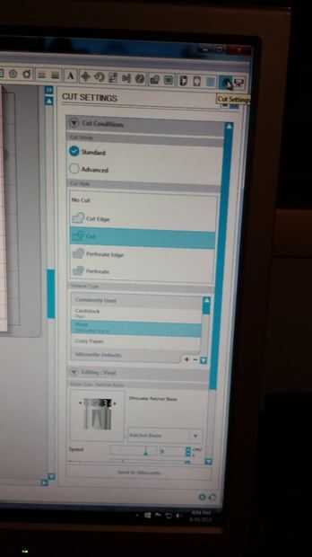 Con sus vinilos en la corte mate, la estera contra las ruedas y presione el botón de arriba, esto tirará el mate un poco. A continuación abra la ventana de configuración de corte y recoger su material. Esto luego le dirá lo que el ajuste de la cuchilla debe y Compruebe la configuración de la hoja.