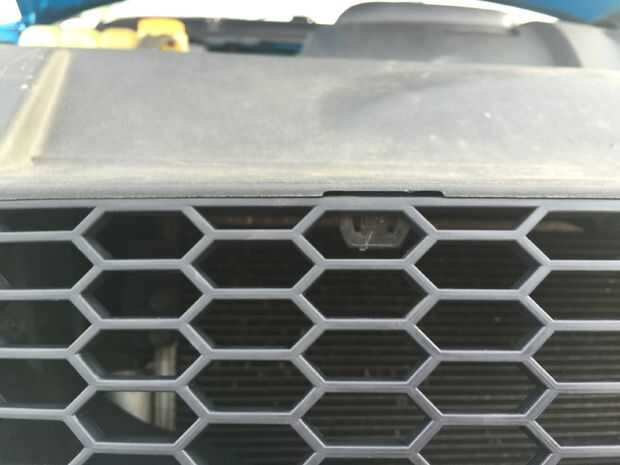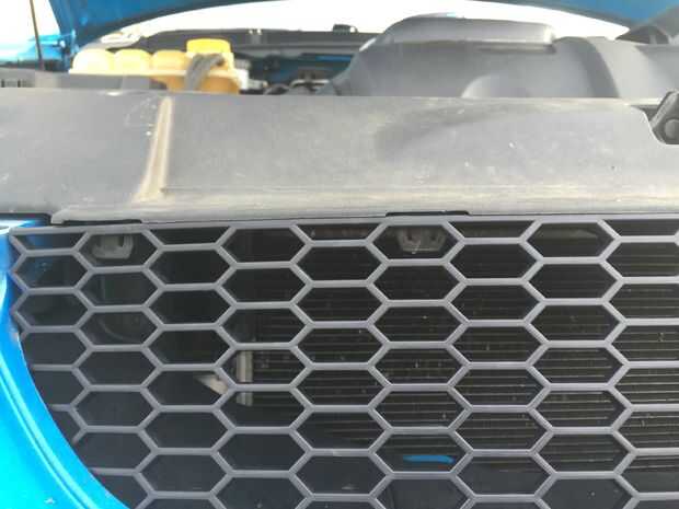 La tapa del radiador utiliza todos los mismo agujeros como antes, pero ahora los clips no se ajuste a la parrilla. En cambio usted empuja detrás de la parrilla donde ayudan a forma de curvatura de la parrilla y mantenga presionado. Observe que el espacio para la palanca de liberación de la tapa encaja en la abertura que hiciste anteriormente. Poner todos los tornillos de plástico y vuelva a colocar el tubo de admisión.