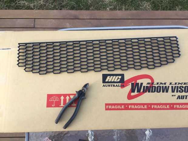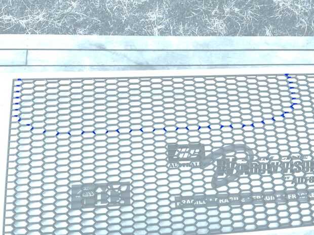Te voy a engañar aquí y darte la plantilla exacta a seguir, cada punto azul señala la ubicación de cada corte que tiene que hacer. Si has comprado la malla correcta, esto le cabe su coche. Corte la parrilla.