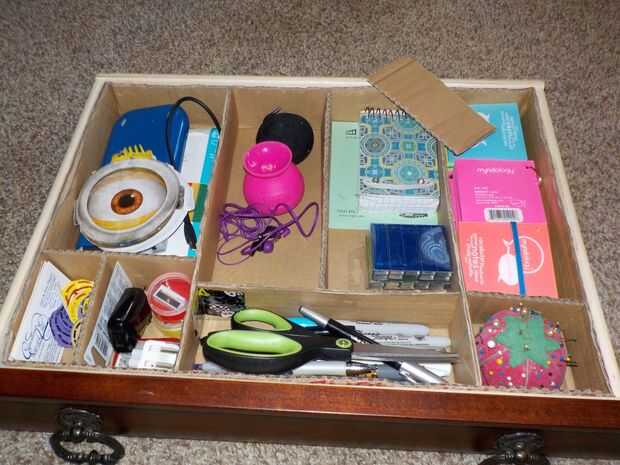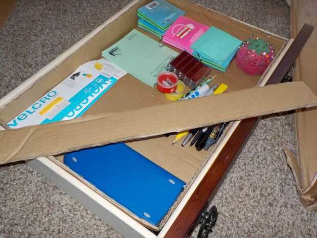 Añadir nuevamente la basura al cajón para que usted puede decidir donde los divisores. Decidir que buzos serán fijo y cuáles pueden ser movibles y acuñados entre los principales divisores. Medida interior altura de la caja y cortar tiras de la altura del interior de la caja y el largo necesario para hacer los separadores. Únalos con cinta adhesiva los principales divisores para la fuerza pero no la cinta a la caja. Pruebe la colocación de los separadores de cartón en la caja.