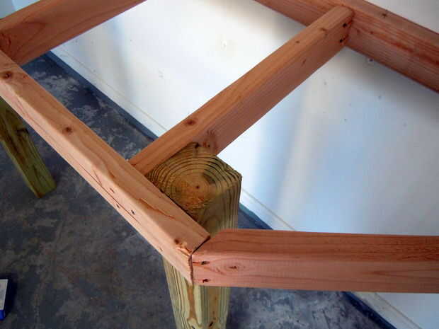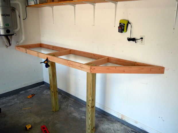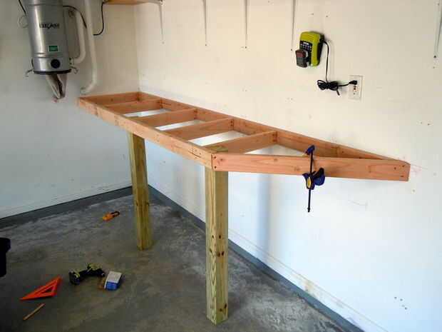 Ya que quería el Banco 9 pies contra la pared y 7 contra el frente, tuve que marco en la esquina del ángulo. Hay un truco con conseguir las piernas para crear una superficie plana debido a la naturaleza inclinada del piso del garaje. Funcionó al final.
