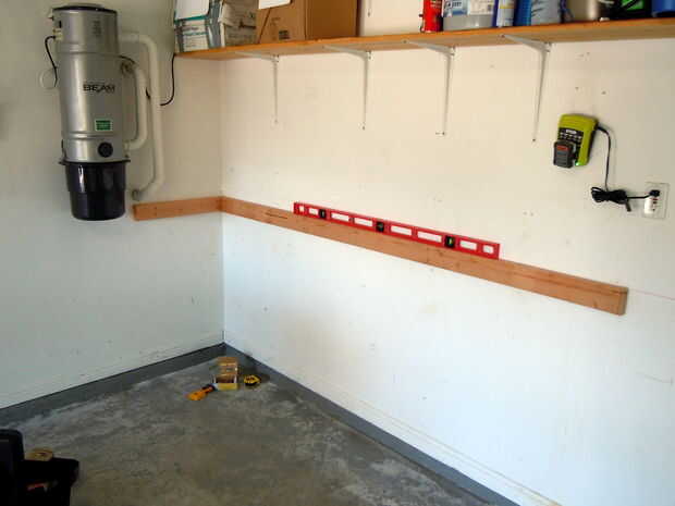 1. el primer marco de apoyo 2 x 4 se pone contra la línea de nivel en el lado de 9 pies en la pared y asegurado con tornillos para madera 2 1/2 en los montantes de la pared del garaje.