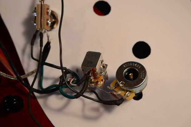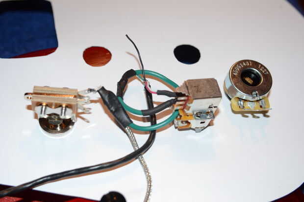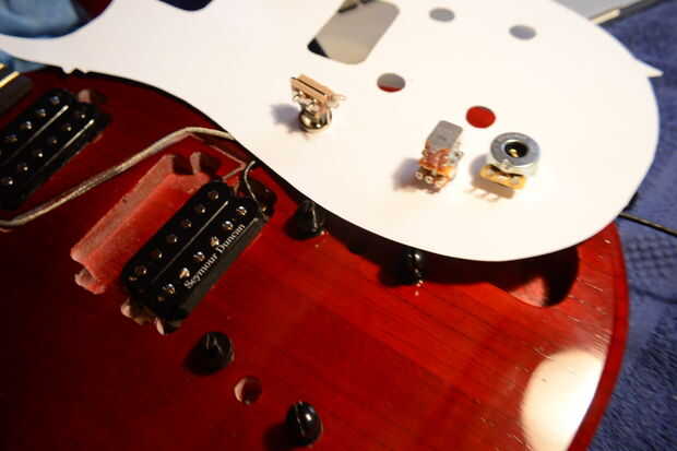 decidí ir con una perilla de 2, 1 interruptor de configuración. Más específicamente, un pote push-pull, una olla regular y un 3 vías interruptor de configuración. El interruptor de push-pull se va a crear una bobina aprovechando el efecto. Para el espacio todo, meto todo en una impresión común de tarjeta impresa de la guardia de la selección. Utilicé un esquema de la Página Web de Seymour Duncan. Tienen más o menos cada arreglo que se puede imaginar.