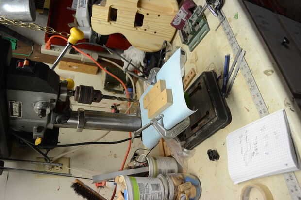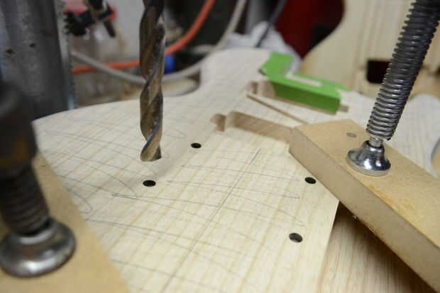 Asegúrese de no rayar el cuerpo demasiado o tendrás a la arena hacia fuera más adelante. Usé una toalla en la mesa del taladro para evitar arañazos o abolladuras. La alineación de estos agujeros es imprescindible para el ajuste del puente y cordal; estar seguro de que tiene la alineación correcta antes de pinza y taladro. Si su cuerpo no ha sido pretaladrado por la máquina, asegúrese de utilizar un punzón para obtener la posición del orificio deseado. También, asegúrese de ajustar la profundidad del taladro para perforar a la profundidad requerida de los insertos de desagüe y el puente. Estoy usando configuración Gotoh Tuno Matic puente y tubo de desagüe, por lo que la profundidad fue ~.944 en.