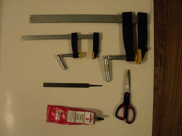 Tuve 4 x 12" abrazaderas de F y 2 x 8" F-pinzas que había usado (tenía múltiples de cada mordaza como hace 6 o 7 de estos marcos en conjunto), un archivo para griding abajo unos lugares para el ajuste apropiado, pegamento acrílico y tijeras para cortar las fotos y la cartulina de papel de construcción a la forma.