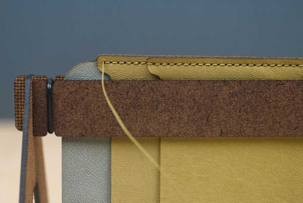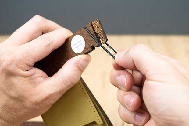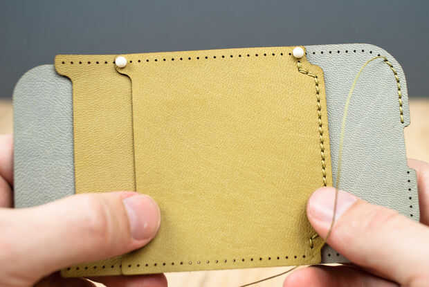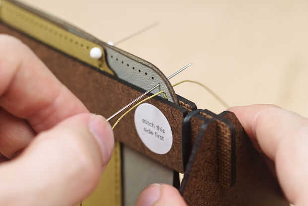 Al final de la primera línea de la costura, puede quitar el cuero del potro de costura, lugar coser pasadores en los orificios más derecho e izquierdos que van a través de todas las piezas de cuero, y volver la piel al potro de costura. Coser esta línea para completar una de las costuras principales.