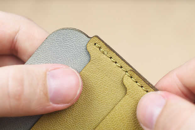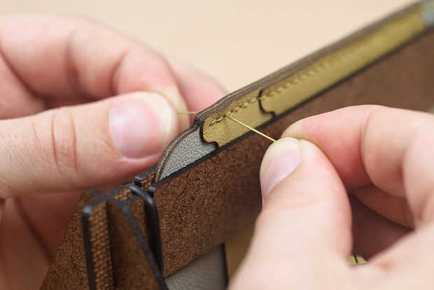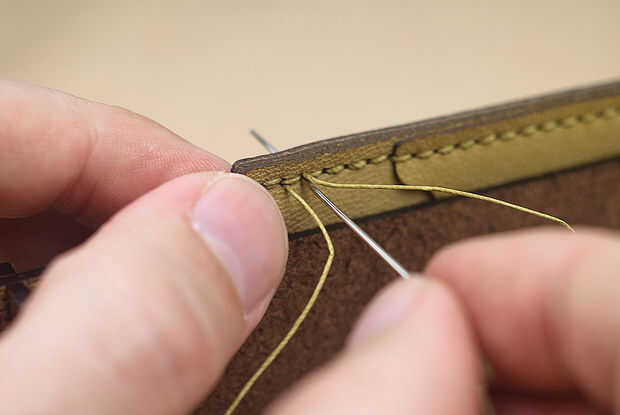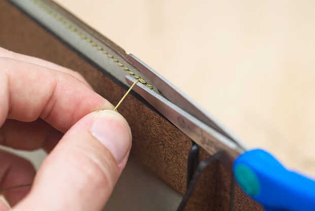 Ahora tendrás dos puntadas a cada lado de la cartera. Agarra ambos hilos y tire de ellas tenso una última vez. Luego utilice las tijeras para cortar los hilos de rosca lo más cerca posible a la costura sin mellar las puntadas.