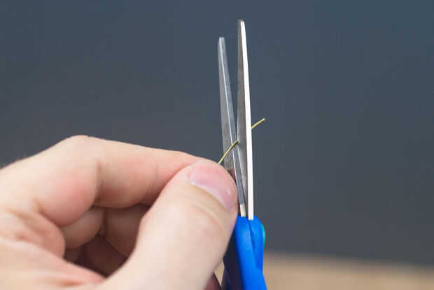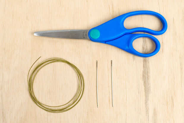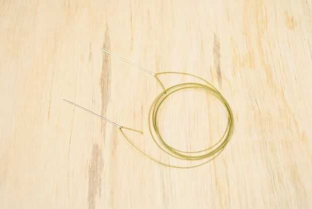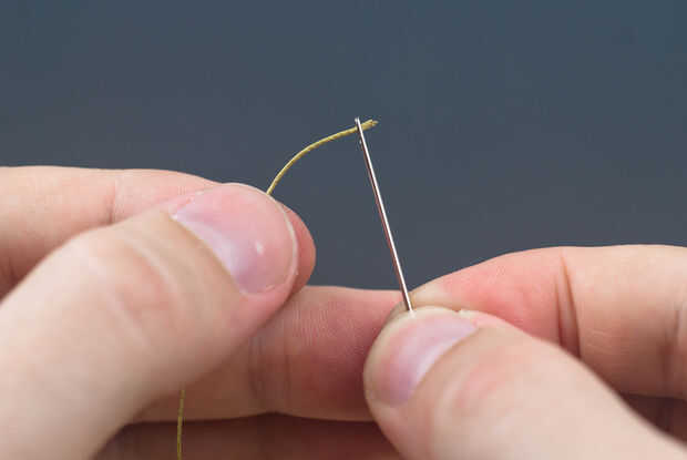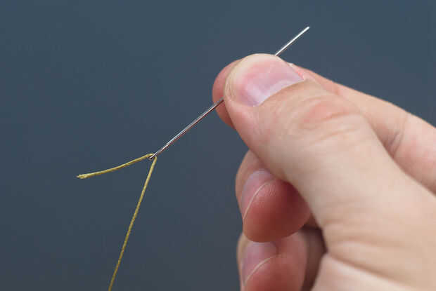 Cortar un extremo del hilo en un ángulo, quitando 1/4" o menos de hilo. Inserte con cuidado en una de las agujas, agarrando el hilo con las puntas de los dedos de la otra mano tan pronto como su a través de la aguja. Jalar el extremo aproximadamente 3/4" más allá del ojo de la aguja y curva detrás hacia el resto del hilo. Repita para la otra aguja. Si el extremo del hilo se convierte en deshilachado, corta otra vez en un ángulo, quitando como poco posible. Enhebrar las agujas puede tomar algunos intentos.