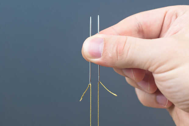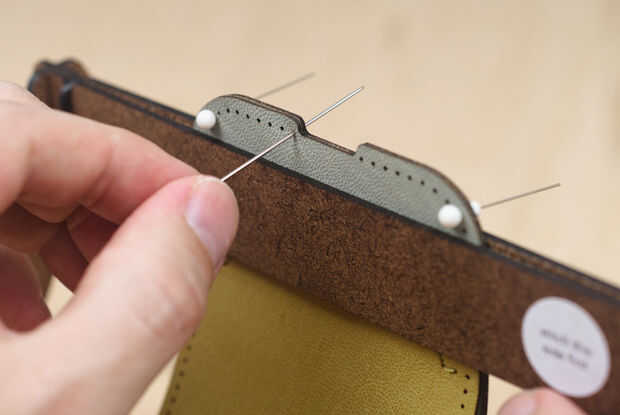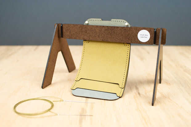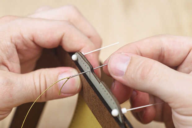 Utilizamos una técnica de costura a mano común llamada la puntada de silla de montar. Crea una costura sólida y atractiva. Iniciar mediante la inserción de las agujas a través del agujero de la derecha del lado que está trabajando (sólo pasará por el medio pedazo de cuero) y tirando del mismo con la otra mano. La punta de la aguja debe ir fácilmente, pero el ojo es más grande y puede proporcionar cierta resistencia. Puede tomar un rápido tirón para tirar de él a través de todo el camino. Una vez, tire de los dos extremos del hilo incluso. Tenga cuidado de no tirar el hilo de la aguja. Si tirar el hilo de la aguja, puede que necesite repetir paso 6.