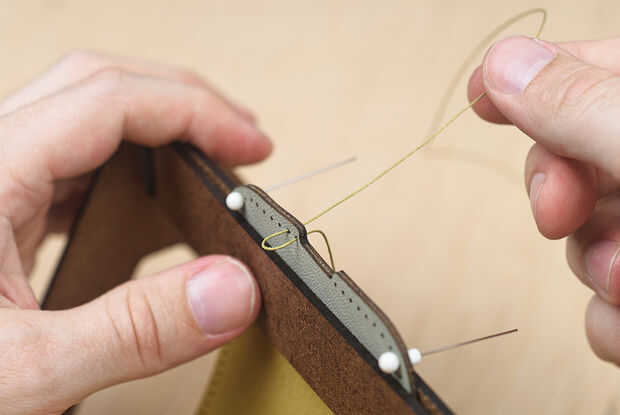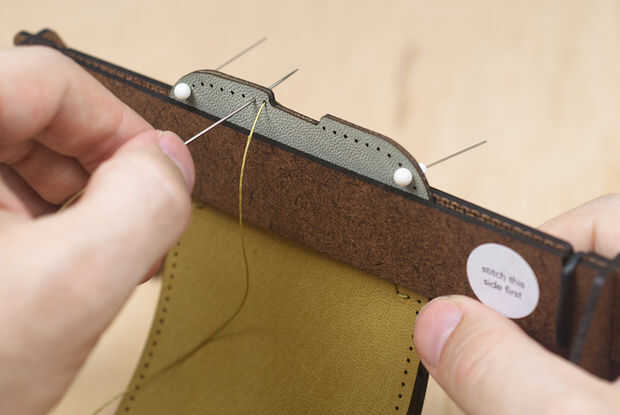 Uno de los bares de pony costura debe etiquetarse "coser este lado primero". Inserte la aguja en el segundo agujero de ese lado y tire de ella a través de todo el camino. Comenzarás en este lado para cada puntada, que creará una costura de aspecto agradable y consistente. La etiqueta ayuda a si pierde la pista.