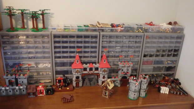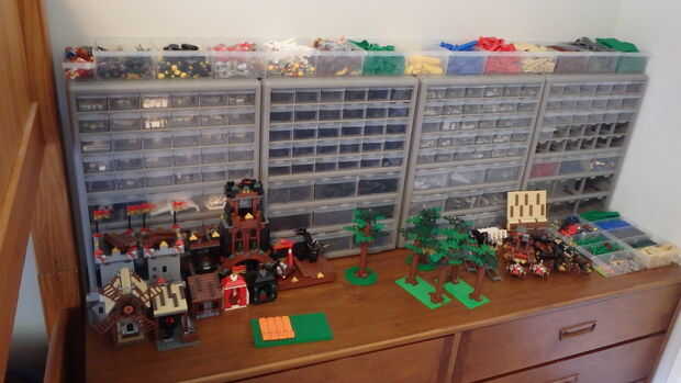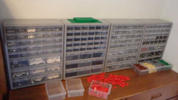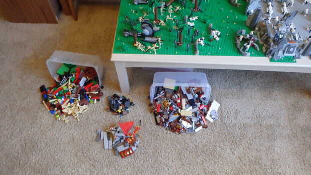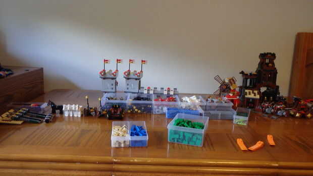 La primera parte de mi compilación consistió en mí recogiendo todos mi caballero que establece Lego y otras piezas que necesitaba. He reunido mis embases y establecerlas todas en mi mesa.