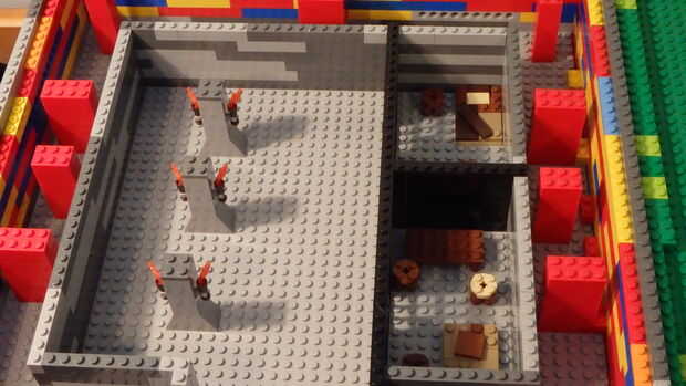 El quinto paso de la mi plan era construir el dungeon. El diseño principal tiene tres pilares, las paredes de la cárcel y detalles de los muebles en las células: cama, mesa y sillas.