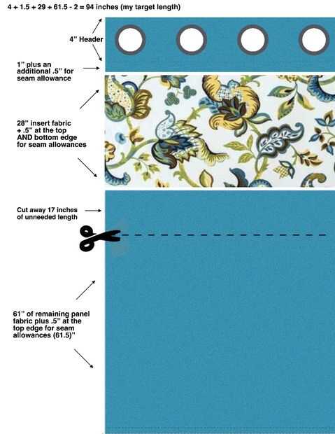 Por supuesto agregar tela me dio demasiada longitud, así que corte a 17 pulgadas adicionales en el panel de Ready-Made, dejándome con una cabecera de 5,5 pulgadas + 61,5" restante pulgadas del panel Ready-Made, que sería añadir/insertar las 29 pulgadas de la tela de relleno. Reste las dos pulgadas de los márgenes y debo acabar con 94" paneles. (Véase la ilustración).