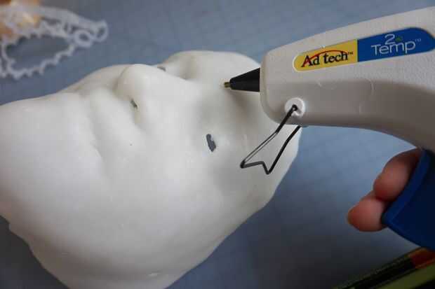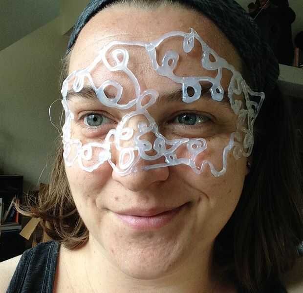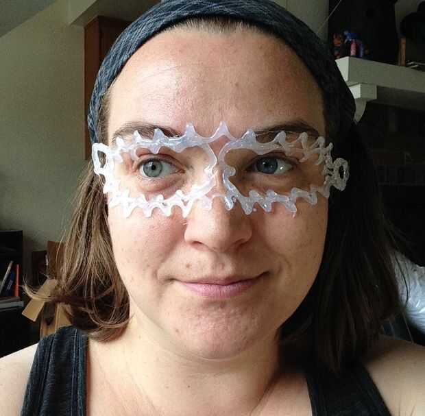 ¿Sabes esa mascarilla completa que hizo volver al principio? Decidí usar como base para la fabricación de encargo pegamento caliente máscaras. Patrones de apriete justo sobre el molde de pegamento caliente temperatura baja (ajuste de temp alta hará más difícil de quitar), permita que se enfríe y pele apagado. Puedes hacer tantos como quieras, muy rápidamente.