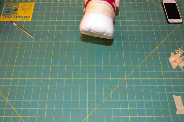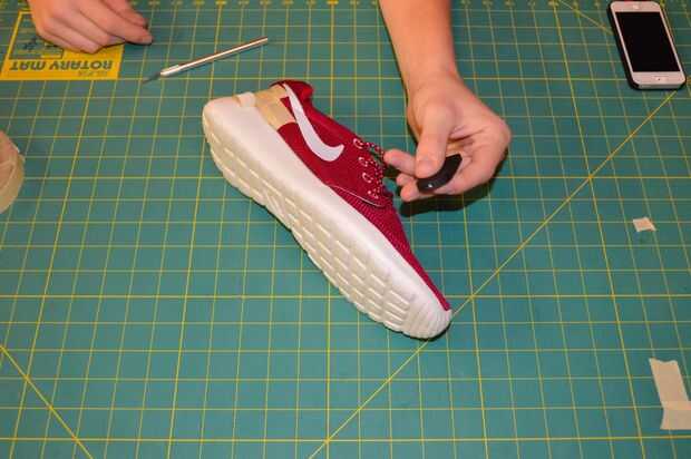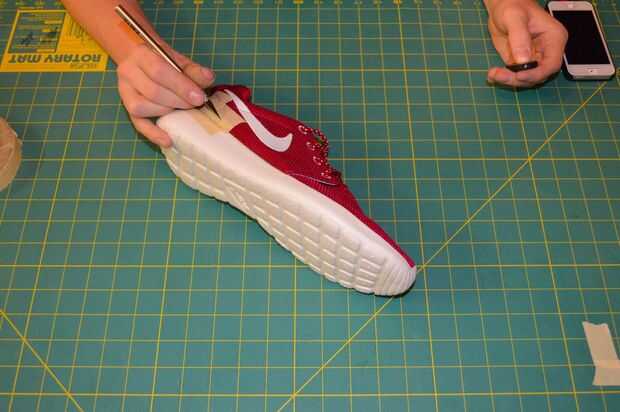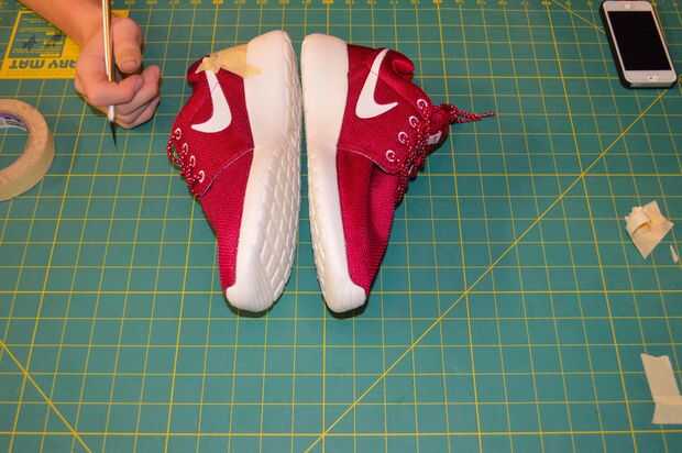 Una vez que el panel de talón está completamente cubierto en cinta su cuchillo y empezar a cortar la forma de la pieza del talón. Hacer cortes de luz para que no dañar el zapato bajo. Comencé en un pedazo de la esquina del talón y trabajó alrededor de él. Hacer varios cortes pequeños en lugar de unos pocos largos, esto es mucho más preciso. Corté las piezas de cinta de en segmentos de aproximadamente media pulgada, esto hace más fácil ver la forma de la zapatilla y hacer cortes más precisos. La cinta debe cubrir perfectamente la pieza de la zapatilla que piensa en la personalización, si es más grande que la pieza recortar con el cuchillo. Si se corta demasiado corto, coloque un nuevo pedazo de cinta sobre el punto se corta y vuelve a cortar. En la última foto se puede ver que la cinta cubre perfectamente el panel de talón trasero.