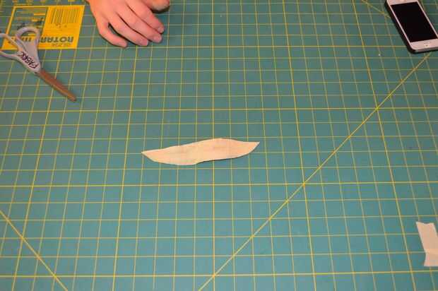 A continuación tenemos que cortarlo fuera empecé cortando un trozo de tela que era manejable y luego lo recortan a la forma exacta de la cinta. Al igual que la cinta tenía que ser perfecto sobre el zapato, la cinta debe encajar perfectamente en la tela, no cortar la tela demasiado corta pero asegúrese de no dejar ningún colgando fuera de la cinta.