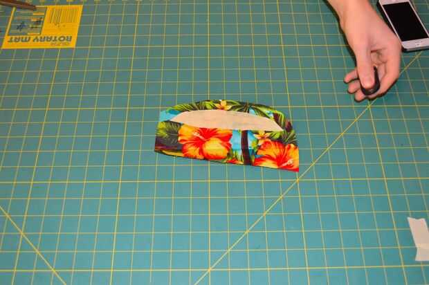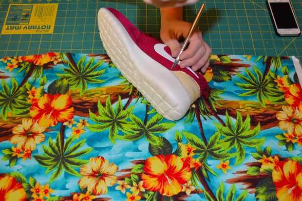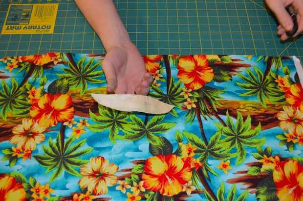 Una vez que la pieza ha sido sacada debe pegarse a la tela. Esta parte es importante si usted está usando un patrón. Asegúrese de colocar la cinta sobre una porción del tejido que crees que quedará bien en el zapato. Coloqué mi que incluía flores, palmeras y agua.