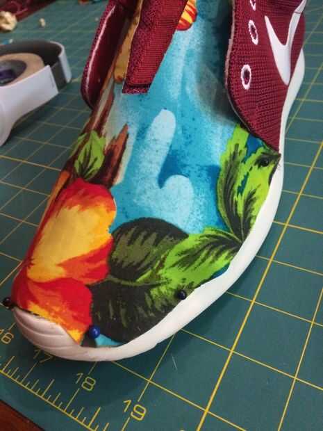 En el segundo zapato que hice un montón de alfileres y me cubrió a la tela hacia abajo en el lugar y fue una gran ayuda. Recomiendo hacer esto porque este zapato resultó mejor que la otra. Cubrió todo abajo con un montón de alfileres y luego quité como pegué abajo. Esto ayudó a la tela detener desplazamiento por el lugar mientras tratas de pegar hacia abajo.