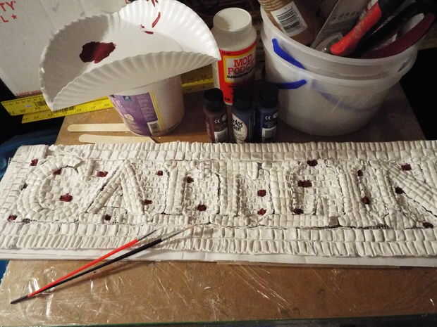 Cuando todo pintado y seco, le di una capa de brillo Mod Podge todo. Esto es para conseguir ese brillo agradable de baldosa cerámica y hacerlo más fácil de limpiar cuando aplicamos la lechada.