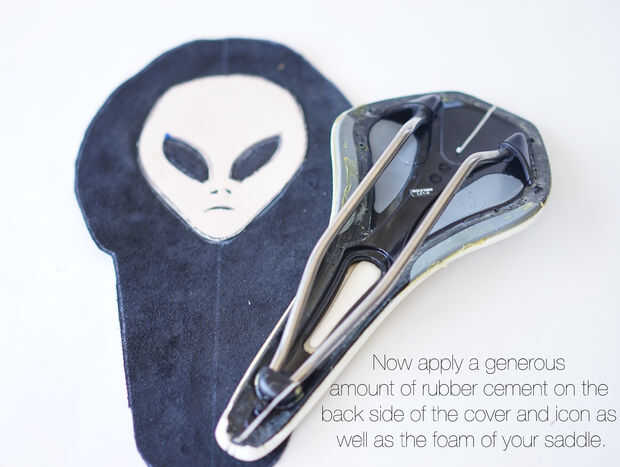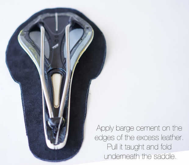 2. Ahora aplique una cantidad generosa de cemento de goma en la parte posterior de la cubierta y el icono como la espuma de la silla de montar. Utilice la línea de centro sobre el cuero y la línea central en el sillín para colocar con precisión. Empujar el exceso de cuero desde el centro. Tire de cuero enseñado con unos alicates en el borde de la cubierta de cuero. Déjelo secar.