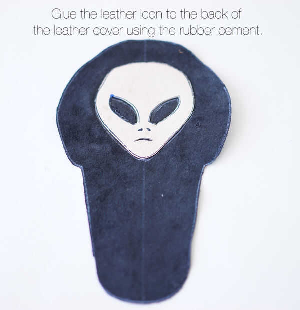 1. Pegue el icono de cuero en la parte posterior de la cubierta de cuero utilizando el cemento de goma. Aplicar el pegamento en lado trasero de la cubierta. Asegúrese de no tener pegamento en las perforaciones si haces un diseño avanzado. Déjelo secar.