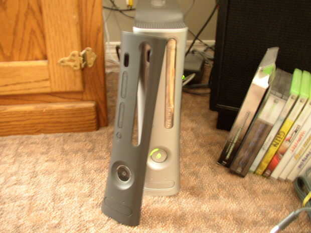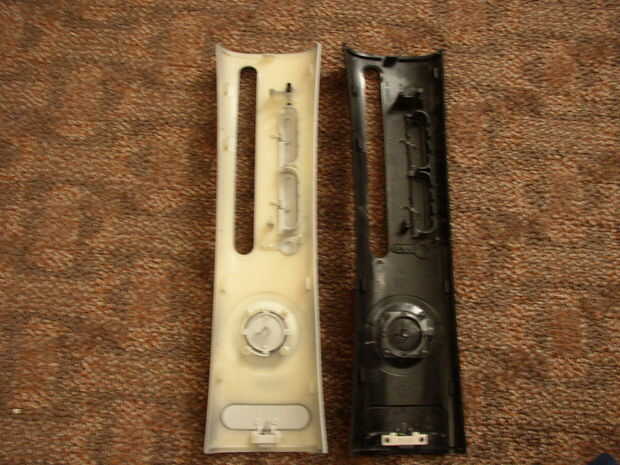 esto le enseña a crear tu propia placa personalizada para tu Xbox 360Paso 1: Primero empezar con quitar las pequeñas aletas y botón de encendido y luego colocar cinta en el frente, usé cinta aislante negra pero cinta adhesiva probablemente trabajaría