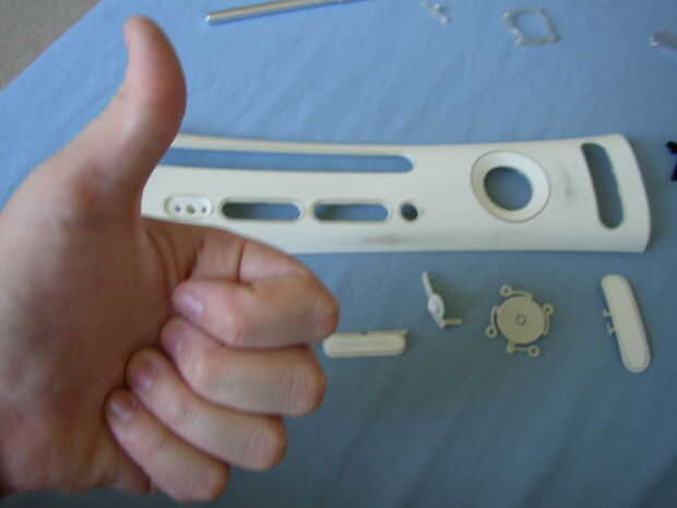 esto le enseña a crear tu propia placa personalizada para tu Xbox 360Paso 1: Primero empezar con quitar las pequeñas aletas y botón de encendido y luego colocar cinta en el frente, usé cinta aislante negra pero cinta adhesiva probablemente trabajaría