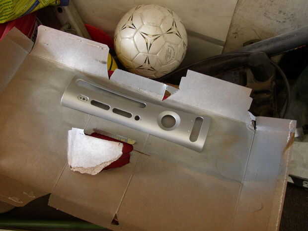 esto le enseña a crear tu propia placa personalizada para tu Xbox 360Paso 1: Primero empezar con quitar las pequeñas aletas y botón de encendido y luego colocar cinta en el frente, usé cinta aislante negra pero cinta adhesiva probablemente trabajaría