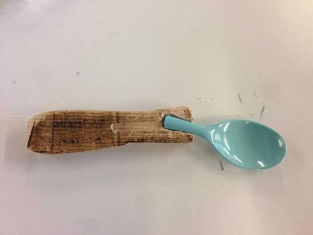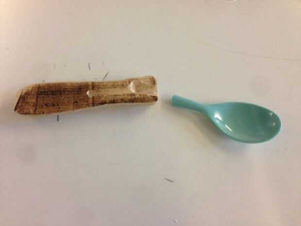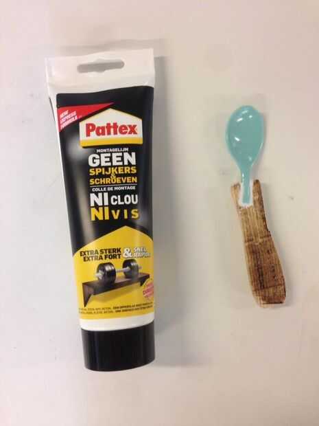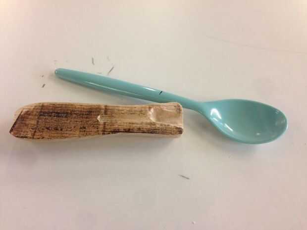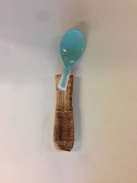 La cuchara se corta con la Sierra de cinta (pero también se puede hacer con una sierra de mano) y luego se pega (con pegamento impermeable) en la madera. El pegamento realmente tiene que ser impermeable por lo que se puede lavar la cuchara.