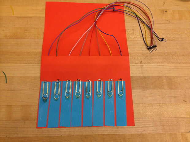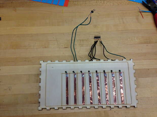 2. soldadura de los cables principales derecha 6 al pin header de 6 en orden y luego soldar los dos hilos restantes para el pin de la cabecera de dos. Recuerde que las posiciones de las dos teclas de la izquierda serán esencialmente ser intercambiadas en el Arduino.
