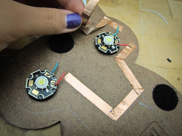 El truco para usar la cinta de cobre es no cortarlo. Utilice una sola pieza continua por doblar en las curvas (ver imagen).