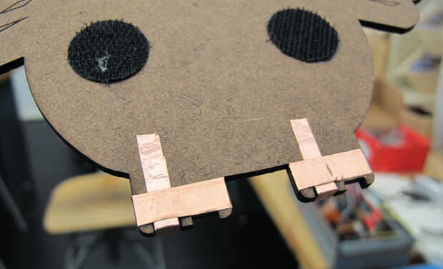 El imanes mantienen el búho en el ritmo en el nido. El cobre conduce la electricidad y enciende los ojos. Debemos aplicar cobre cinta overtop de los imanes para asegurarse que se realiza una conexión entre la batería y los LEDs.