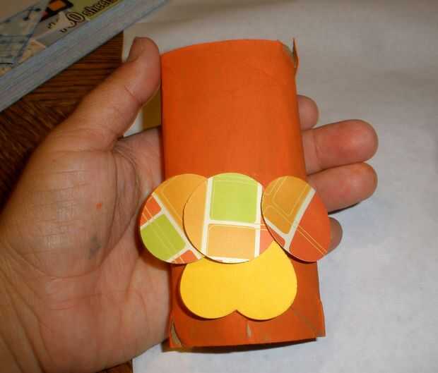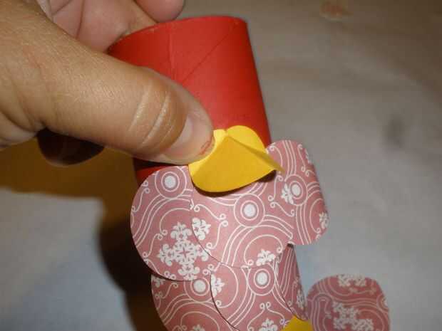 Teniendo en cuenta que la parte superior del rollo se dobla hacia abajo, pegué las solapas de pico para el tubo directamente por encima de la segunda fila de círculos.