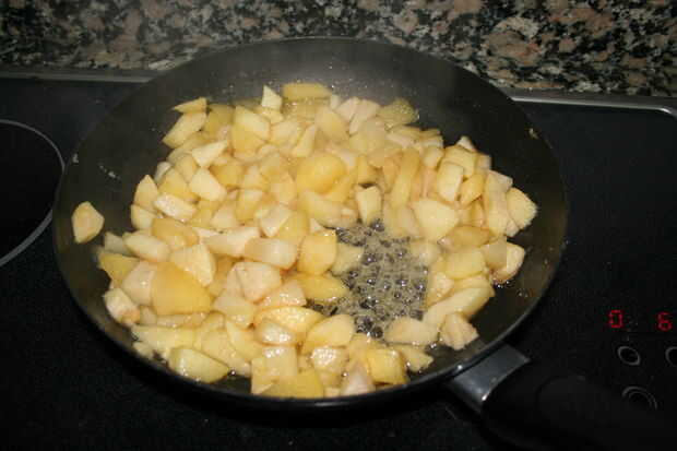 En una sartén poner la fruta y añadir el azúcar, cuando es líquido el azúcar añadir el zumo de limón y cocinar lentamente y cocine por 18 minutos o cuando la fruta esté tierna