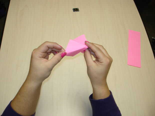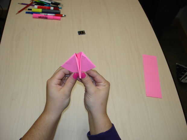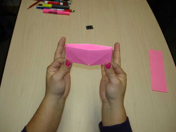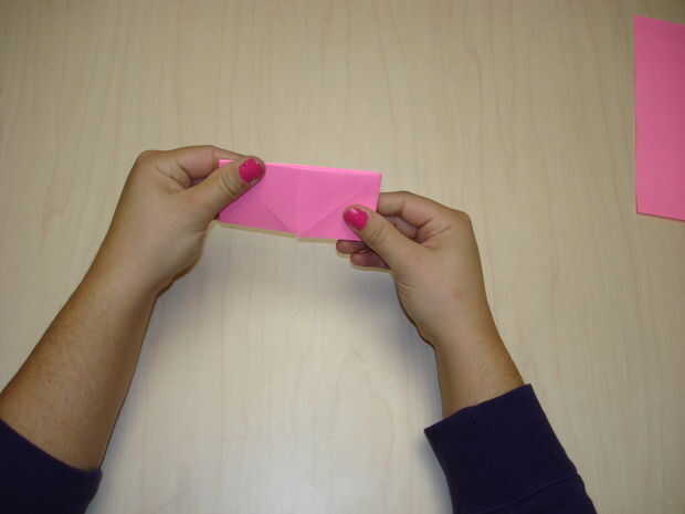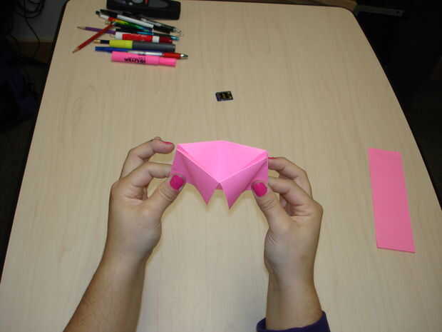 Fold the paper in half. Con la apertura de la tapa hacia arriba, apriete las esquinas inferiores y empuje hacia adentro, creando un diamante. Tire de las aletas flojas.